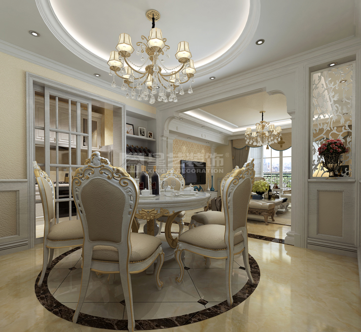 设计师用暖黄色和白色相互搭配,营造出一种温馨中带着洁净的欧式风格居家体验,墙面使用了硅藻泥进行整体的涂刷,并配以简欧的墙裙设计,让墙面造型更加突出。客厅和餐厅之间设计了隔断和富含欧式元素的门套设计,让空间的独立感更加强烈。
